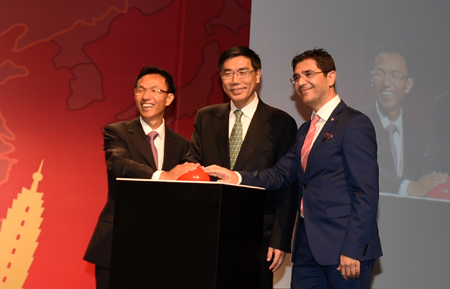 圖為在土耳其伊斯坦布爾舉行的收購(gòu)慶典儀式上,中國(guó)駐土耳其大使郁紅陽(yáng)(左)、中國(guó)工商銀行董事長(zhǎng)姜建清(中)和伊斯坦布爾省副省長(zhǎng)伊斯梅爾·居爾泰金為工行行標(biāo)揭幕。