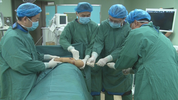 文登整骨醫(yī)院醫(yī)護(hù)人員在為橈骨頸骨折患者行骨折閉合穿針內(nèi)固定術(shù)。資料照片 |