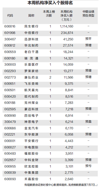 跟隨“國家隊(duì)”腳步,本周以來機(jī)構(gòu)席位護(hù)盤力度不斷加強(qiáng)。若從機(jī)構(gòu)凈買入額看,以銀行股為代表的藍(lán)籌股獲得機(jī)構(gòu)大手筆買入。比如民生銀行,不論從近三周還是本周來看,都是機(jī)構(gòu)凈買入額最大的個股。本周二,民生銀行現(xiàn)身龍虎榜,買入榜單中前四席位均被機(jī)構(gòu)占據(jù),賣出方中,僅有一家機(jī)構(gòu)席位現(xiàn)身,機(jī)構(gòu)席位合計凈買入111億元。近三周來,機(jī)構(gòu)凈買入金額排名第二位是中信銀行,本周和上周各上榜一次,機(jī)構(gòu)席位合計凈買入24億元。(陳文彬)