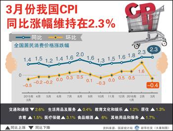 3月物價數(shù)據(jù)延續(xù)了自去年年底以來的回暖趨勢。國家統(tǒng)計局11日公布的數(shù)據(jù)顯示,全國居民消費價格指數(shù)(CPI)同比上漲2.3%,漲幅繼上月后繼續(xù)維持在2%以上;工業(yè)生產(chǎn)者出廠價格(PPI)環(huán)比上漲0.5%,這是自2014年1月份以來的首次上漲,同比下降4.3%,降幅繼續(xù)收窄。