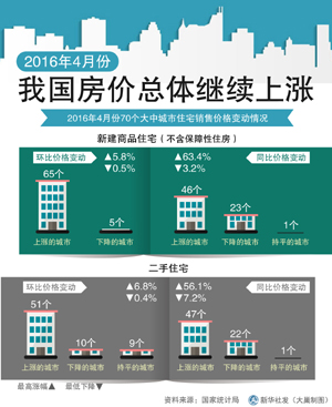 國家統(tǒng)計(jì)局城市司高級(jí)統(tǒng)計(jì)師劉建偉表示,無論從上漲城市數(shù)量還是漲幅都可以看出,房價(jià)整體在上漲。發(fā)布的數(shù)據(jù)顯示,4月70個(gè)大中城市新建商品住宅價(jià)格環(huán)比上漲的城市有65個(gè),比上月增加3個(gè),下降的城市有5個(gè),比上月減少3個(gè);環(huán)比漲幅在1%以上的城市有22個(gè),比上月增加4個(gè),環(huán)比漲幅在5%以上的城市有2個(gè),比上月增加1個(gè);最高漲幅為5.8%,比上月擴(kuò)大0.4個(gè)百分點(diǎn)。
