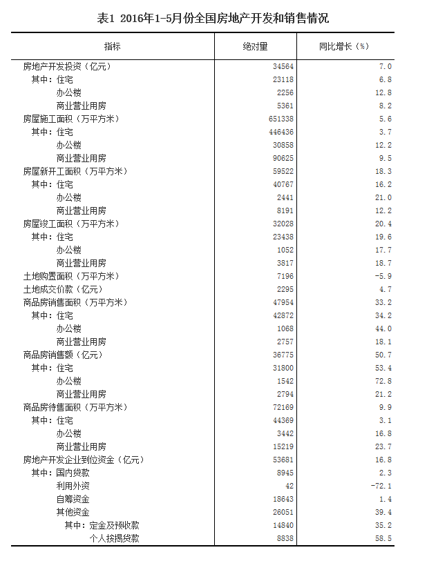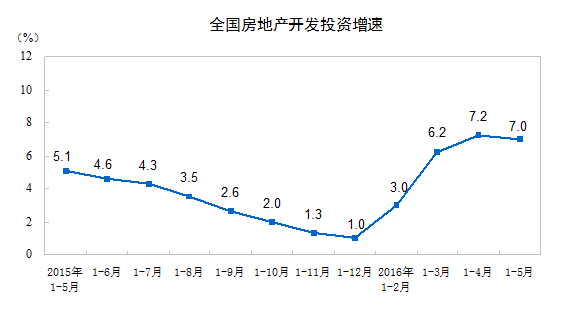 2016年1-5月份,全國房地產(chǎn)開發(fā)投資34564億元,同比名義增長7.0%,增速比1-4月份回落0.2個百分點。其中,住宅投資23118億元,增長6.8%,增速提高0.4個百分點。住宅投資占房地產(chǎn)開發(fā)投資的比重為66.9%。