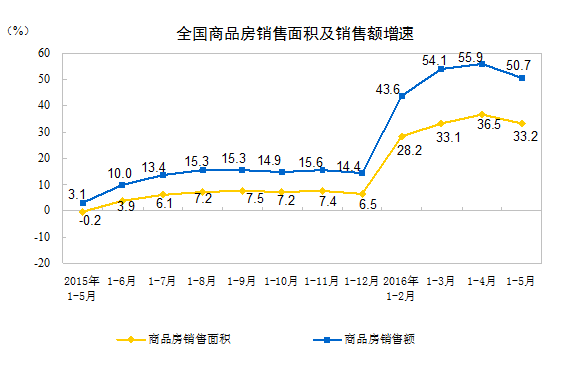 1-5月份,商品房銷售面積47954萬平方米,同比增長33.2%,增速比1-4月份回落3.3個百分點。其中,住宅銷售面積增長34.2%,辦公樓銷售面積增長44.0%,商業(yè)營業(yè)用房銷售面積增長18.1%。商品房銷售額36775億元,增長50.7%,增速回落5.2個百分點。其中,住宅銷售額增長53.4%,辦公樓銷售額增長72.8%,商業(yè)營業(yè)用房銷售額增長21.2%。
