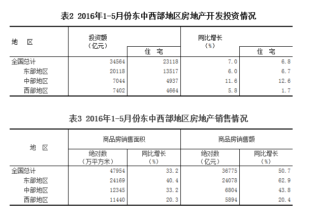 1-5月份,東部地區(qū)房地產(chǎn)開發(fā)投資20118億元,同比增長6.0%,增速比1-4月份提高0.2個百分點;中部地區(qū)投資7044億元,增長11.6%,增速回落0.7個百分點;西部地區(qū)投資7402億元,增長5.8%,增速回落0.8個百分點。