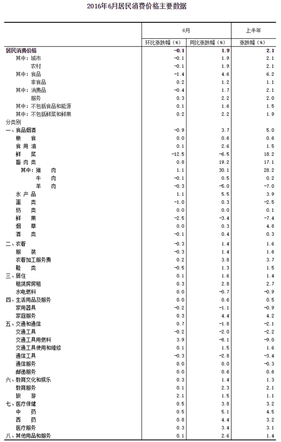 2016年6月份,全國居民消費價格總水平同比上漲1.9%。其中,城市上漲1.9%,農村上漲1.9%;食品價格上漲4.6%,非食品價格上漲1.2%;消費品價格上漲1.7%,服務價格上漲2.2%。上半年,全國居民消費價格總水平比去年同期上漲2.1%。