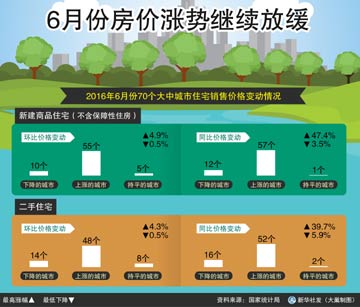 2016年上半年,房地產(chǎn)市場在短短6個(gè)月內(nèi)跌宕起伏。18日,國家統(tǒng)計(jì)局發(fā)布6月70個(gè)大中城市住宅銷售價(jià)格變動(dòng)情況顯示,6月70個(gè)大中城市環(huán)比上漲城市數(shù)量55個(gè),較上月減少5個(gè),與4月價(jià)格上漲個(gè)數(shù)相比,減少10個(gè),連續(xù)兩個(gè)月下降。漲幅方面,環(huán)比、同比最高漲幅有所收窄,具體來看,環(huán)比最高漲幅較5月的5.5%收窄0.6個(gè)百分點(diǎn),同比漲幅較5月的54%收窄6.6個(gè)百分點(diǎn)。