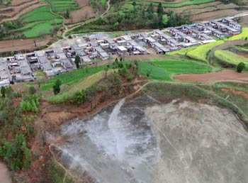 這是記者近日拍攝的甘肅省隴南市徽縣江洛鎮(zhèn)劉壩村一尾礦庫。這個(gè)尾礦庫下方除了有70、80戶居民外,還有1所學(xué)校。根據(jù)統(tǒng)計(jì),隴南全市“頭頂庫”下面集中著22個(gè)村和居民區(qū),31座選礦廠,2所學(xué)校和2座炸藥庫。近年來,當(dāng)?shù)匚驳V庫陸續(xù)發(fā)生險(xiǎn)情,警訊不斷,隱患重重。記者 周華/攝? |