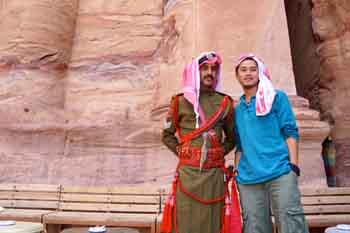 我在路邊小攤上買下了一塊具有阿拉伯風(fēng)格的頭巾,也被當?shù)厝死嬌狭藷熝b,我想,就讓我做一天約旦人,去融入這玫瑰之城,去體味這千年的時光足印。
