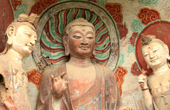 由于麥積山石質皆為紫褐色的水成子母巖,不宜精雕細鏤,所以大多采用泥塑和繪畫,尤以泥塑藝術見長,被譽為“東方雕塑藝術館”。麥積山塑像,主要題材有佛、菩薩、弟子、天王、力士等,盡管歷代塑像同處一堂,但并不因襲模仿,而是保持著各自的時代特色,系統(tǒng)地反映了我國泥塑藝術的發(fā)展和演變過程。