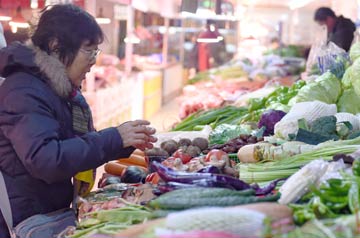 | 1月10日,市民在長春市錦華副食農(nóng)貿(mào)市場內(nèi)選購蔬菜。新華社記者 張楠/攝? |