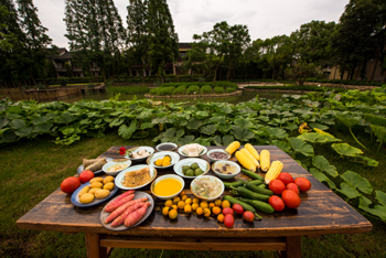 烏村恢復舊時農(nóng)家門前屋后有菜園的景象,大量的農(nóng)耕地種植了應(yīng)時的農(nóng)作物,在午餐時可品嘗烏村特色“一小時蔬菜”,菜肴從采摘到上菜僅需1小時,新鮮到無可挑剔。游玩時垂釣所得的野生塘魚還可在烏村廚房進行烹飪。