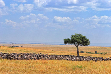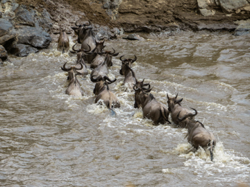 在東非坦桑尼亞的塞倫蓋蒂草原和相鄰肯尼亞的馬賽馬拉草原,每年有超過100萬頭黑尾牛羚?。ń邱R)、15萬頭斑馬和35萬頭瞪羚,從原本散居的塞倫蓋蒂草原南部,不約而同地輾轉(zhuǎn)來到鄰國肯尼亞的馬賽馬拉草原。但面積只有塞倫蓋蒂約1/8的馬賽馬拉草原并不足以維持過百萬頭外來動物的生活,于是在馬賽馬拉生活一兩個月后,于11月短雨季來臨前,動物又千里迢迢的折返,重回塞倫蓋蒂草原,開始一個新的遷徙。如此循環(huán)往復(fù),年復(fù)一年,周而復(fù)始。有人計算過,動物在一年中共會行進(jìn)3000公里,途中危機四伏,歷盡生老病死,有多達(dá)一半的牛羚會在途中被獵食或因體力不支而死。但同時間亦有約40萬頭牛羚在長雨季來臨前出生,為無休止的艱苦旅程增添生氣。