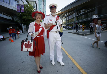 ??? 7月1日是加拿大國慶日,溫哥華當日舉辦活動,慶祝加拿大建國150周年?!D為一對老夫婦精心打扮參加國慶日活動。新華社發(fā)(梁森 攝) |