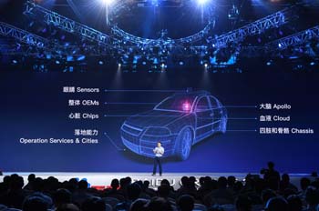 ??? 7月5日,百度AI開發(fā)者大會在北京國家會議中心舉行,近5000名開發(fā)者和生態(tài)合作伙伴參會,百度在會上公布了完整的AI生態(tài)開放戰(zhàn)略。圖為百度集團總裁兼首席運營官陸奇發(fā)布百度Apollo開放平臺。記者 申宏 攝 |