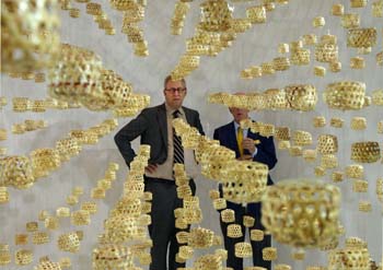 ??? 7月2日,2017上海夏季音樂節(jié)在上海交響樂團開幕,圖為紐約愛樂樂團執(zhí)行董事比爾·托馬斯(左)為2017上海夏季音樂節(jié)揭曉藝術(shù)裝置《夏音》。《夏音》由2400個傳統(tǒng)手工制作的蟈蟈籠子組成,以聲音喚醒樂迷對童年時夏天的回憶。記者 任瓏 攝 |