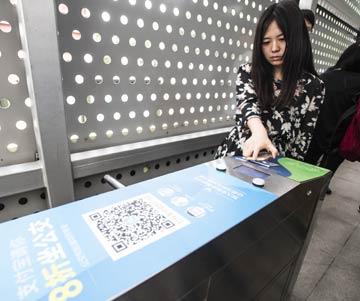 6月14日,乘客在武漢BRT武昌火車站刷支付寶進站乘車。螞蟻金服數(shù)據(jù)顯示,武漢城區(qū)98%的出租車、超過80%的超市便利店、超過75%的餐飲門店、休閑娛樂等行業(yè)均支持移動支付。去年武漢市共有超過100萬人次,使用支付寶在醫(yī)院掛號、就診。?記者 肖藝九/攝 |