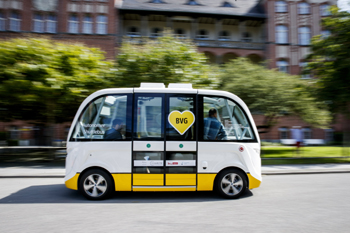 ??? 7月31日,在德國柏林,法國公司Navya制造的無人駕駛電動汽車行駛在柏林醫(yī)科大學內。柏林公交公司計劃2018年在柏林醫(yī)科大學內開通兩條無人駕駛電動汽車專線。新華社/歐新 |