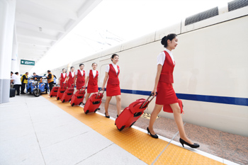 ??? 8月8日,在白城火車(chē)站,動(dòng)車(chē)列車(chē)員列隊(duì)上車(chē)。當(dāng)日,長(zhǎng)(長(zhǎng)春)白(白城)烏(烏蘭浩特)鐵路正式開(kāi)通運(yùn)營(yíng)。長(zhǎng)白烏鐵路起自吉林省長(zhǎng)春市,途徑吉林省松原市、大安市、白城市,止于內(nèi)蒙古自治區(qū)烏蘭浩特市,全長(zhǎng)412公里,運(yùn)營(yíng)時(shí)速160公里,是內(nèi)蒙古自治區(qū)首條跨區(qū)域動(dòng)車(chē)組列車(chē)運(yùn)行線路。記者 張楠 攝