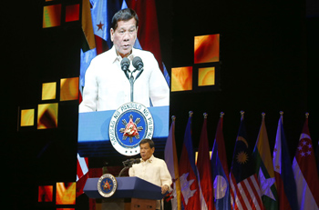 ??? 8月8日,在菲律賓馬尼拉,東盟輪值主席國(guó)菲律賓總統(tǒng)杜特爾特在慶祝儀式上講話。東盟8日在馬尼拉舉行成立50周年慶典。新華社/美聯(lián)