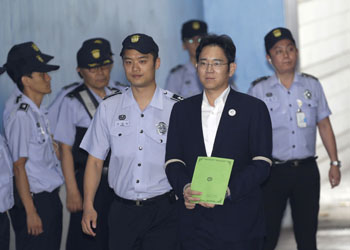 ??? 8月7日,在韓國(guó)首爾,三星電子副會(huì)長(zhǎng)李在镕(前右)抵達(dá)首爾中央地方法院。就韓國(guó)三星電子副會(huì)長(zhǎng)李在镕行賄前總統(tǒng)樸槿惠一案,檢察官7日建議首爾中央地方法院判處這名三星集團(tuán)實(shí)際“掌門(mén)人”12年監(jiān)禁。新華社/美聯(lián)