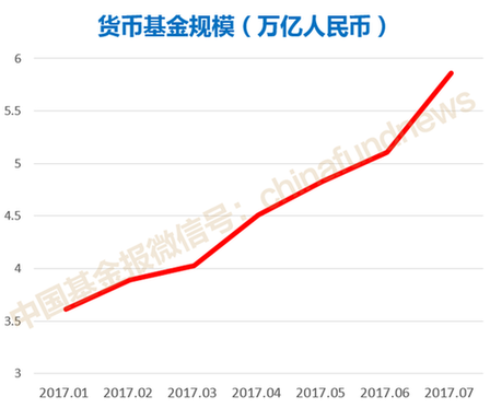 中國基金業(yè)協(xié)會公布的官方數(shù)據(jù)顯示,2017年1月貨幣基金規(guī)模為3.61萬億元,3月和6月分別增加到4.03萬億元和5.11萬億元,7月更是進(jìn)一步飆升到了5.86萬億元。