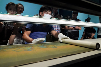 ??? 北京故宮博物院2017年的年度大展——《千里江山——?dú)v代青綠山水畫特展》9月15日在午門展廳和東西雁翅樓開展。展覽以北宋王希孟的《千里江山圖》為中心,系統(tǒng)梳理、展示中國歷代青綠山水畫的發(fā)展脈絡(luò)。圖為故宮博物院的工作人員將《千里江山圖》布置到展柜中。記者 沈伯韓 攝 |