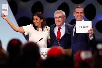 ??? 9月13日,國際奧委會(huì)主席巴赫(中)在宣布2024和2028年奧運(yùn)會(huì)主辦城市后與巴黎市長(zhǎng)伊達(dá)爾戈(左)和洛杉磯市長(zhǎng)加切蒂慶祝。當(dāng)日,國際奧委會(huì)在秘魯首都利馬舉行的第131次全會(huì)上最終確定巴黎為2024年夏季奧運(yùn)會(huì)主辦地、洛杉磯為2028年夏季奧運(yùn)會(huì)主辦地。新華社發(fā)(路易斯·卡馬喬 攝) |