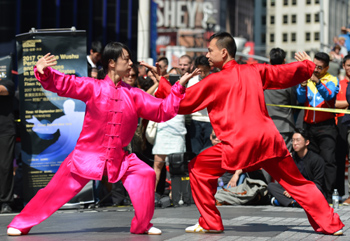 ??? 9月10日,在美國紐約時(shí)報(bào)廣場(chǎng),武術(shù)運(yùn)動(dòng)員陳思坦(右)和林旭表演“太極對(duì)練”。當(dāng)日,由中國國家體育總局與國際武術(shù)聯(lián)合會(huì)發(fā)起、以“和諧、健康、共享”為主題的武術(shù)表演活動(dòng)在時(shí)報(bào)廣場(chǎng)舉行。數(shù)十位中國優(yōu)秀武術(shù)運(yùn)動(dòng)員和美國本土武術(shù)愛好者共同在這里為觀眾獻(xiàn)上太極拳、太極扇、太極對(duì)練、集體拳等表演,展示了中國武術(shù)文化的風(fēng)采。記者 李睿 攝 |