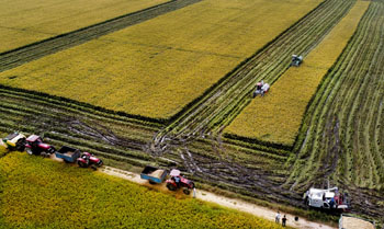 ??? 9月17日,安徽霍邱縣范橋鎮(zhèn)種糧大戶戚仁杰組織收割機(jī)收獲水稻。地處淮河南岸的霍邱縣是產(chǎn)糧大縣,今年全縣195萬畝水稻豐收在望。種糧大戶、范橋鎮(zhèn)雙元村村民戚仁杰2010年流轉(zhuǎn)1200多畝淮河行洪區(qū)的水田,成立眾樂糧食種植專業(yè)合作社,進(jìn)行全機(jī)械化作業(yè),連年取得好收成,今年畝產(chǎn)達(dá)到700多公斤,總產(chǎn)糧食700多公斤,總產(chǎn)糧食80多萬公斤。記者 陶明 攝 |