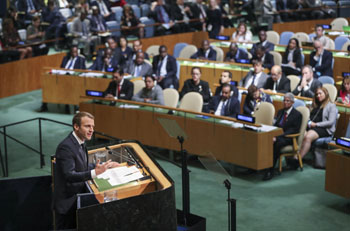 ??? 9月19日,在紐約聯(lián)合國總部,法國總統(tǒng)馬克龍?jiān)诼?lián)大一般性辯論上發(fā)言。第72屆聯(lián)合國大會一般性辯論19日在紐約聯(lián)合國總部開始舉行。記者 王迎 攝 |