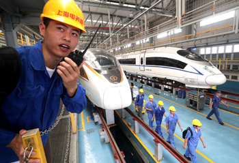 ??? 9月19日,技術(shù)保障人員進(jìn)入上海虹橋“復(fù)興號”動車檢修庫進(jìn)行相關(guān)作業(yè)。21日起,“復(fù)興號”動車組在京滬高鐵提速至350公里時速運(yùn)行。記者 陳飛 攝 |
