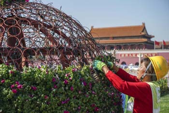 ??? 9月18日,工作人員在天安門廣場布置花卉。當(dāng)日,天安門廣場國慶花卉布置工作開始。據(jù)介紹,國慶期間天安門廣場中心將布置“祝福祖國”巨型花籃,東西長安街將各擺放7組花壇。記者 殷剛 攝 |