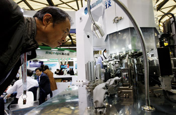 ??? 10月25日,參觀者在觀察一臺芯片測試包裝一體機的作業(yè)演示。當日,第90屆中國電子展在上海新國際博覽中心舉行。1300家展商在本屆展會上集中展示集成電路、電子元器件、智能制造、智能硬件等電子信息產業(yè)領域內的最新技術和成果。記者 方喆 攝 |
