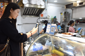 ??? 10月23日,市民在香港寶達街市內用支付寶掃碼付款。當日,支付寶HK在香港寶達街市試點推廣“無現(xiàn)金街市”,打造香港首個智能化無現(xiàn)金街市。記者 秦晴 攝 |