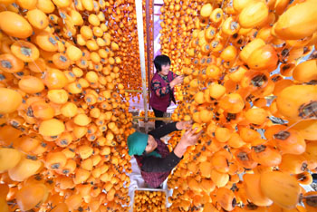 ??? 10月24日,山東省沂源縣悅莊鎮(zhèn)陳家官莊村的農民在翻晾吊曬的柿子。金秋時節(jié),沂源縣5萬畝柿子迎來收獲季,農民們忙著采摘柿子、加工柿餅,一派紅火忙碌的豐收景象。新華社發(fā)(趙東山 攝) |