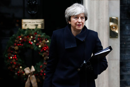 ??? 12月11日,在英國倫敦,英國首相特雷莎·梅走出唐寧街10號(hào)首相府。特雷莎·梅11日說,英國預(yù)計(jì)向歐盟支付350億至390億英鎊(約合470億至520億美元)的“脫歐分手費(fèi)”,但條件是雙方未來要達(dá)成一份貿(mào)易協(xié)議。新華社/法新