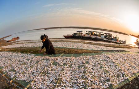 ??? 12月8日,在江西鄱陽湖都昌印山附近湖灘,漁民在晾曬鳳尾魚干。連日來,江西鄱陽湖畔魚干飄香。漁民將捕獲的鳳尾魚晾曬,加工成魚干供應(yīng)各地市場。新華社發(fā)(傅建斌 攝)