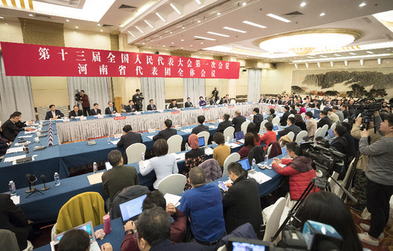 3月6日,十三屆全國人大一次會議河南代表團(tuán)全體會議向媒體開放。新華社記者 丁海濤 攝