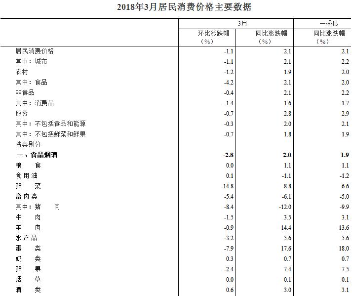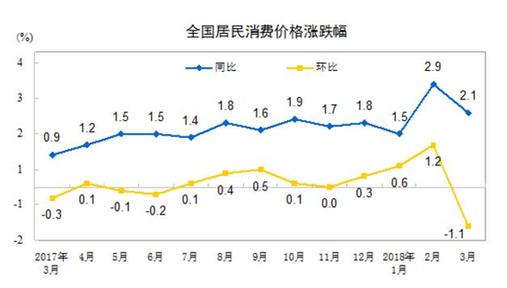 4月11日,國家統(tǒng)計局發(fā)布統(tǒng)計數(shù)據(jù),2018年3月份,全國居民消費價格同比上漲2.1%。其中,城市上漲2.1%,農(nóng)村上漲1.9%;食品價格上漲2.1%,非食品價格上漲2.1%;消費品價格上漲1.6%,服務(wù)價格上漲2.8%。一季度,全國居民消費價格總水平比去年同期上漲2.1%。