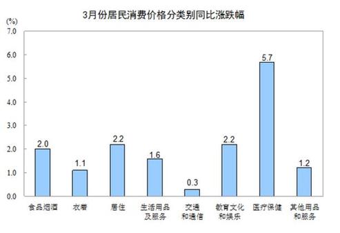 其他七大類價格同比均上漲。其中,醫(yī)療保健、居住、教育文化和娛樂價格分別上漲5.7%、2.2%和2.2%,生活用品及服務(wù)、其他用品和服務(wù)價格分別上漲1.6%和1.2%,衣著、交通和通信價格分別上漲1.1%和0.3%。
