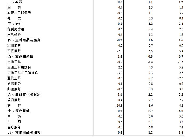 其他七大類價格環(huán)比三漲四降。其中,衣著、居住、醫(yī)療保健價格分別上漲0.6%、0.2%和0.2%;教育文化和娛樂、交通和通信價格分別下降1.6%和1.5%,其他用品和服務(wù)、生活用品及服務(wù)價格分別下降0.5%和0.2%。