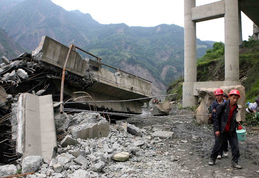 2008年5月14日,老百姓從倒塌的白花大橋旁走過(guò)。此次大地震中,震中地區(qū)汶川縣附近的道路受到嚴(yán)重破壞。記者 袁滿(mǎn) 攝