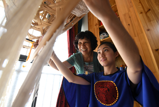 右圖為譚湘光(左)在工作室指導(dǎo)學(xué)生使用傳統(tǒng)織錦機(jī)。