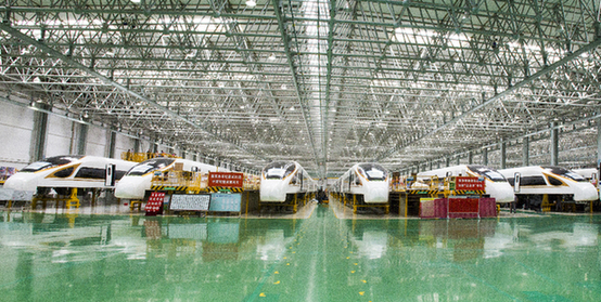 在中車長客股份有限公司總裝車間,即將下線的“復興號”中國標準動車組蔚為壯觀。(中車長客供圖)
