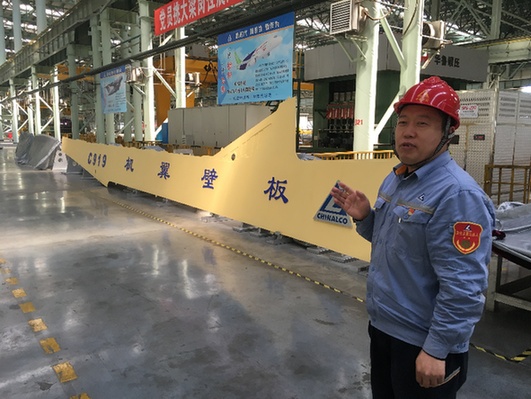 中厚板廠黨總支書(shū)記劉海付向記者介紹東輕公司為大飛機(jī)項(xiàng)目配套的機(jī)翼壁板生產(chǎn)情況。記者 王淮志 攝