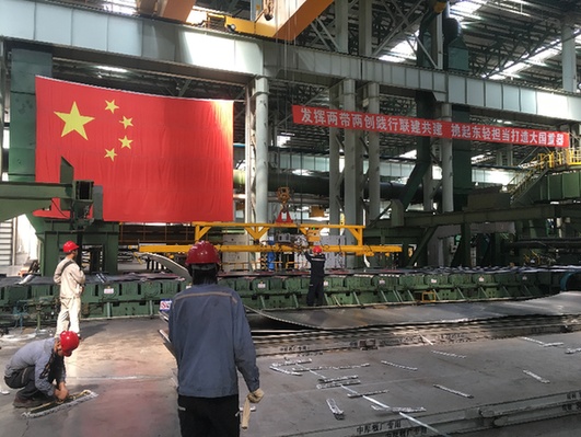 國(guó)旗與“兩帶兩創(chuàng)”的條幅掛在生產(chǎn)車間的醒目位置。記者 王淮志 攝