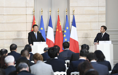 習(xí)近平指出,在務(wù)實合作方面,中法既要深挖市場的“源頭活水”,也要疏浚政策的“河道溝渠”。雙方要深化核能、航空、航天等傳統(tǒng)領(lǐng)域合作,加快科技創(chuàng)新、農(nóng)業(yè)、金融、養(yǎng)老服務(wù)等新興領(lǐng)域合作步伐。我們贊賞總統(tǒng)先生多次表達同中方開展“一帶一路”務(wù)實合作的意愿,雙方要落實好“一帶一路”第三方市場合作示范項目。要為雙邊貿(mào)易與投資提供更多支持和便利。我們剛剛頒布了《外商投資法》,將繼續(xù)大幅放寬市場準入,優(yōu)化營商環(huán)境,加強知識產(chǎn)權(quán)保護,打造高水平對外開放新格局。我們歡迎更多法國企業(yè)赴華投資興業(yè),也希望法方為中國企業(yè)在法投資提供公平、開放、非歧視待遇。