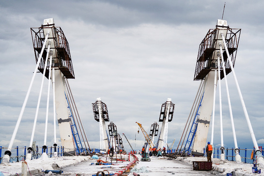 中俄合建的首座跨境公路大橋——黑河到布拉戈維申斯克黑龍江(阿穆爾河)大橋進(jìn)入橋面鋪裝施工作業(yè)階段。(記者 王建威 攝)