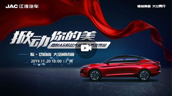 德品兼?zhèn)?,大眾同行;“掀”動自由,大空間轎跑——江淮嘉悅A5粉絲大會暨上市發(fā)布會于2019年11月20日18:00在廣州舉行。