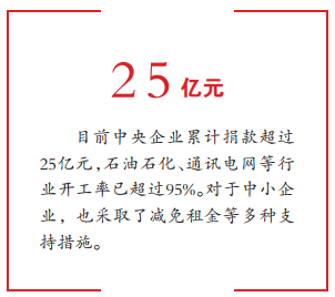 2月18日,國(guó)務(wù)院聯(lián)防聯(lián)控機(jī)制召開(kāi)的新聞發(fā)布會(huì)上,國(guó)務(wù)院國(guó)資委副主任任洪斌介紹,為支援保障疫情防控阻擊戰(zhàn),目前中央企業(yè)累計(jì)捐款超過(guò)25億元,石油石化、通訊電網(wǎng)等行業(yè)開(kāi)工率已超過(guò)95%。對(duì)于中小企業(yè),也采取了減免租金等多種支持措施。
